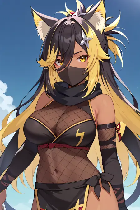ninjanekoyo, multicolored hair, black hair, yellow eyes, long hair, animal ear fluff, animal ears, hair ornament, large breasts, mouth mask, ninja, dark skin female, fishnets, cat tail, black scarf, black bridal gauntlets