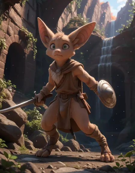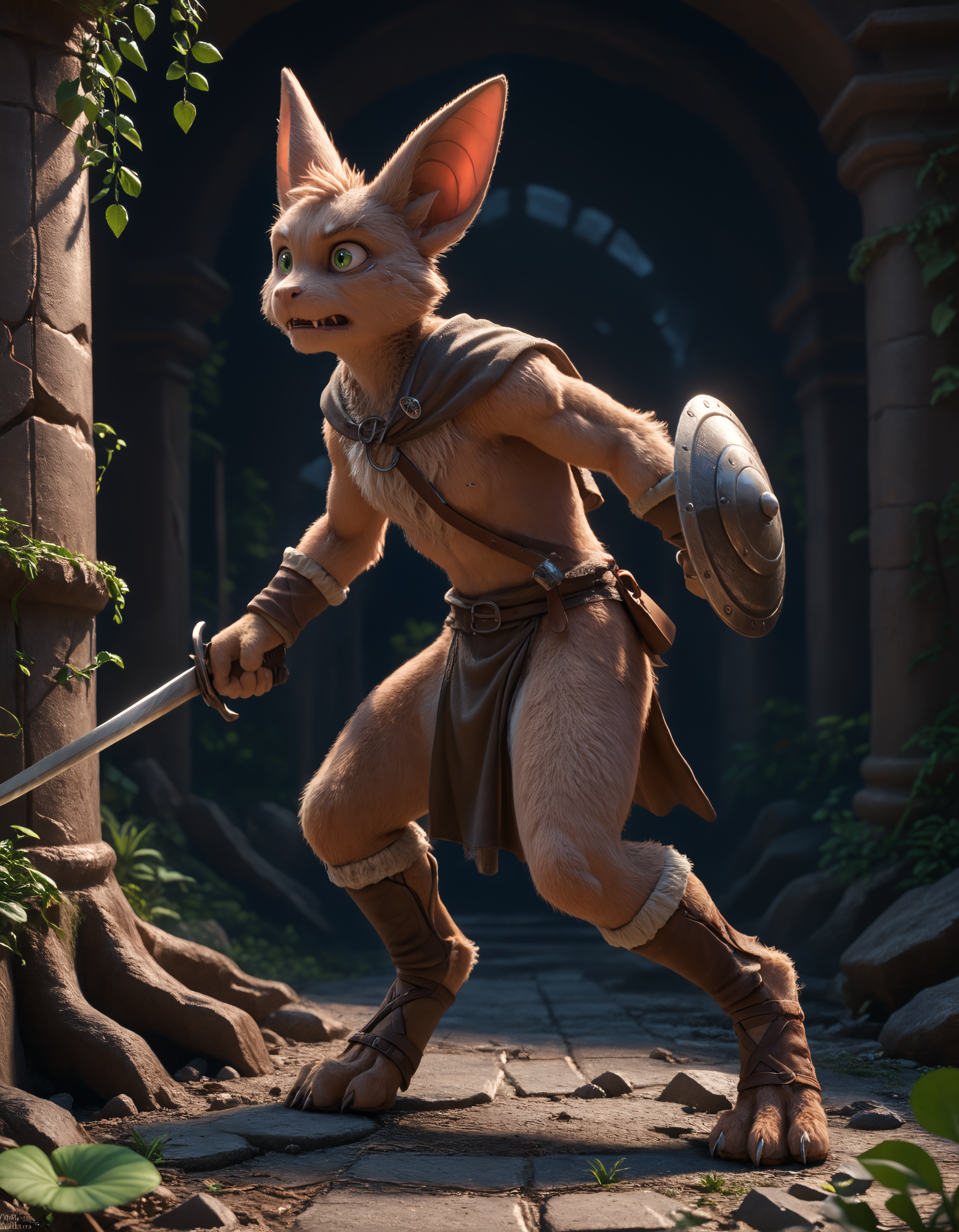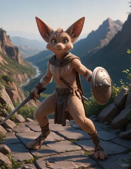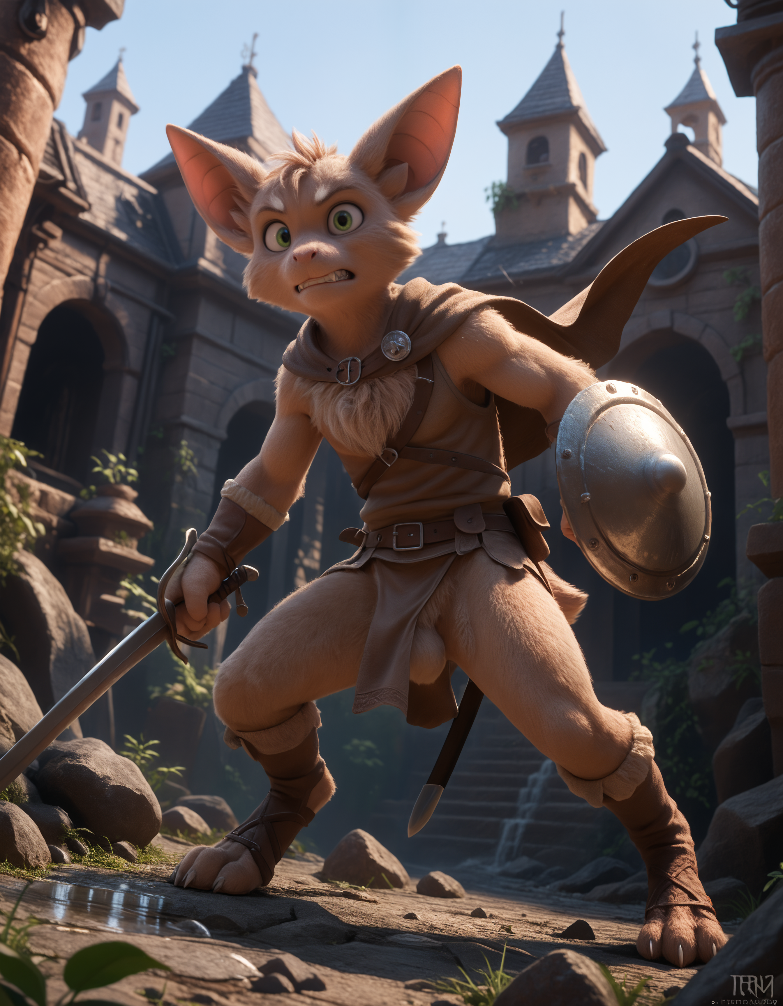 // Pony: turo_of_akesh, wingless bat, tan fur, green eyes, digitigrade, bat ears, male focus, sword, shield, weapon, holding sword, holding weapon, holding, loincloth