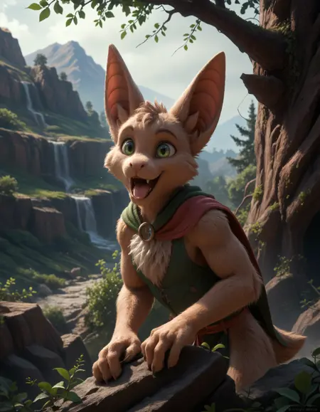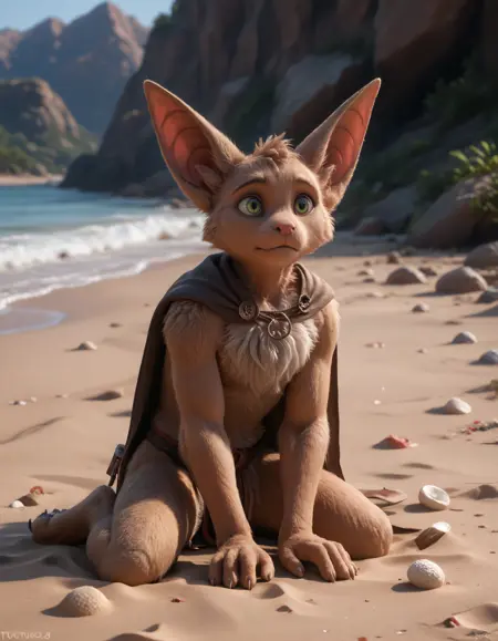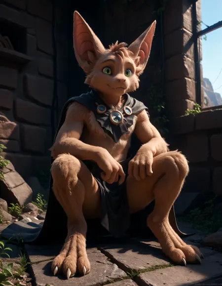 // Illustrious: turo_of_akesh, male, 1boy, bat boy, solo, green eyes, body fur, tail, clothing, sheath, cape, claws
