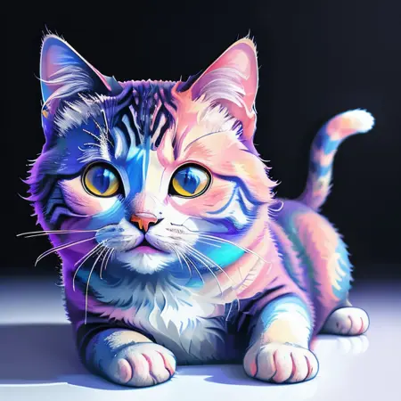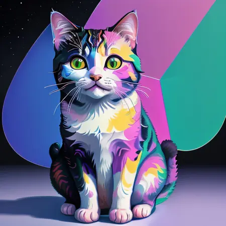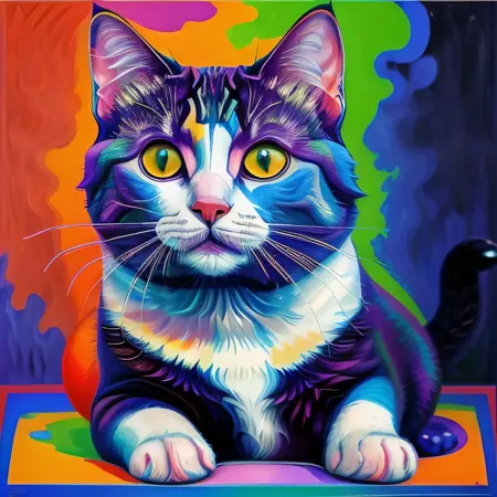 masterpiece, full scale photo, full body cat, clear shapes, hyper realistic, highly detailed, sharp focus, high resolution, best quality, colorful, friendly colors, studio lighting, 8K, fauvism cat, <lora:FauvismCat:1>