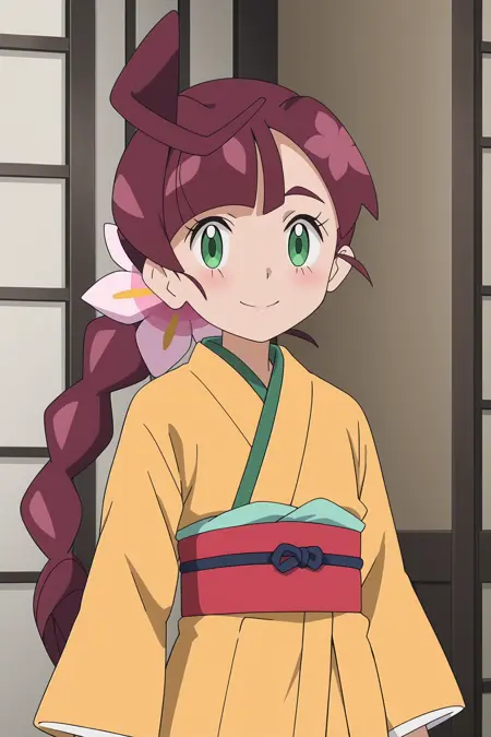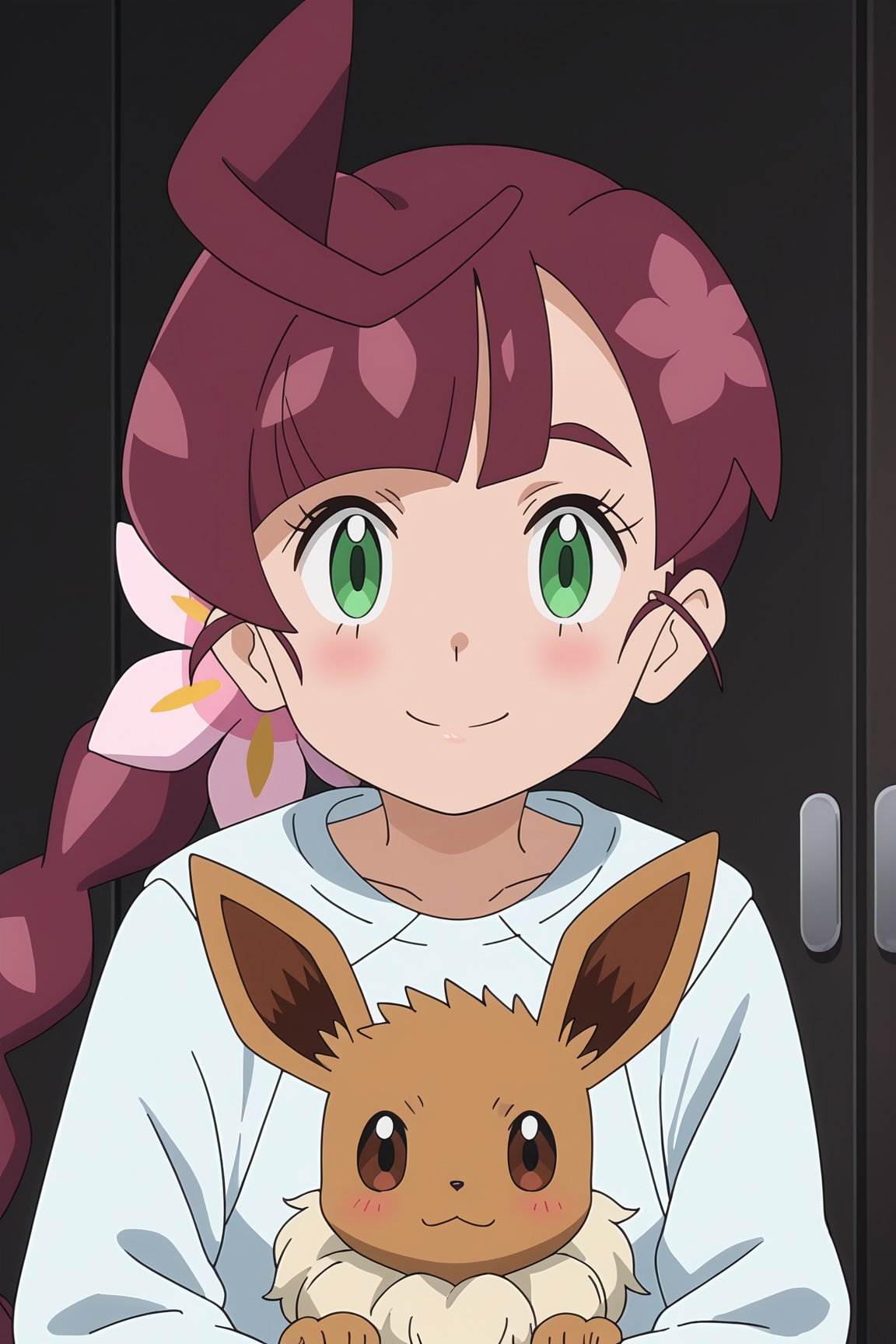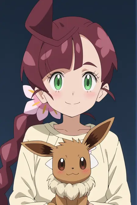 1girl, chloe \(pokemon\), pokemon journeys, green eyes, brown hair, ahoge, hair flower, braided ponytail, long hair, eyelashes,