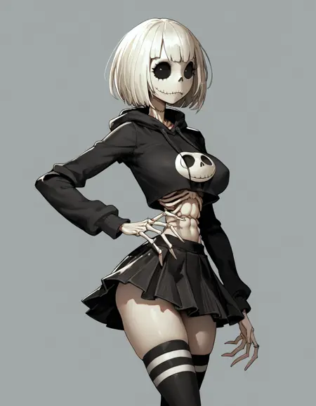 부정적: 인간(긍정적 텍스트에 no_humans를 사용하는 것이 더 효과적일 수 있음?), 머리카락, 귀, 눈 등 반복적으로 나타나는 원치 않는 요소. 뼈대가 있는 잭 스켈링턴을 생성하려 할 때 두개골도 유용할 수 있습니다.