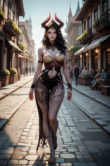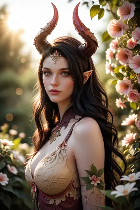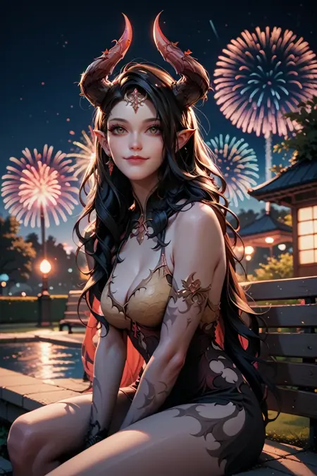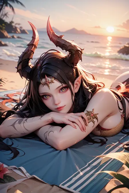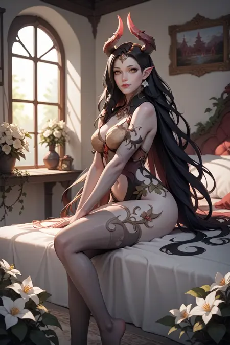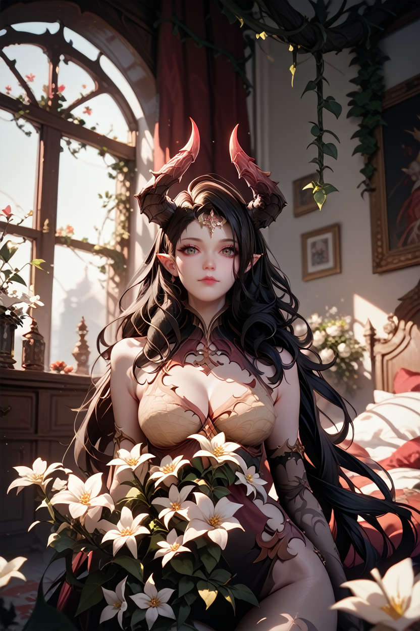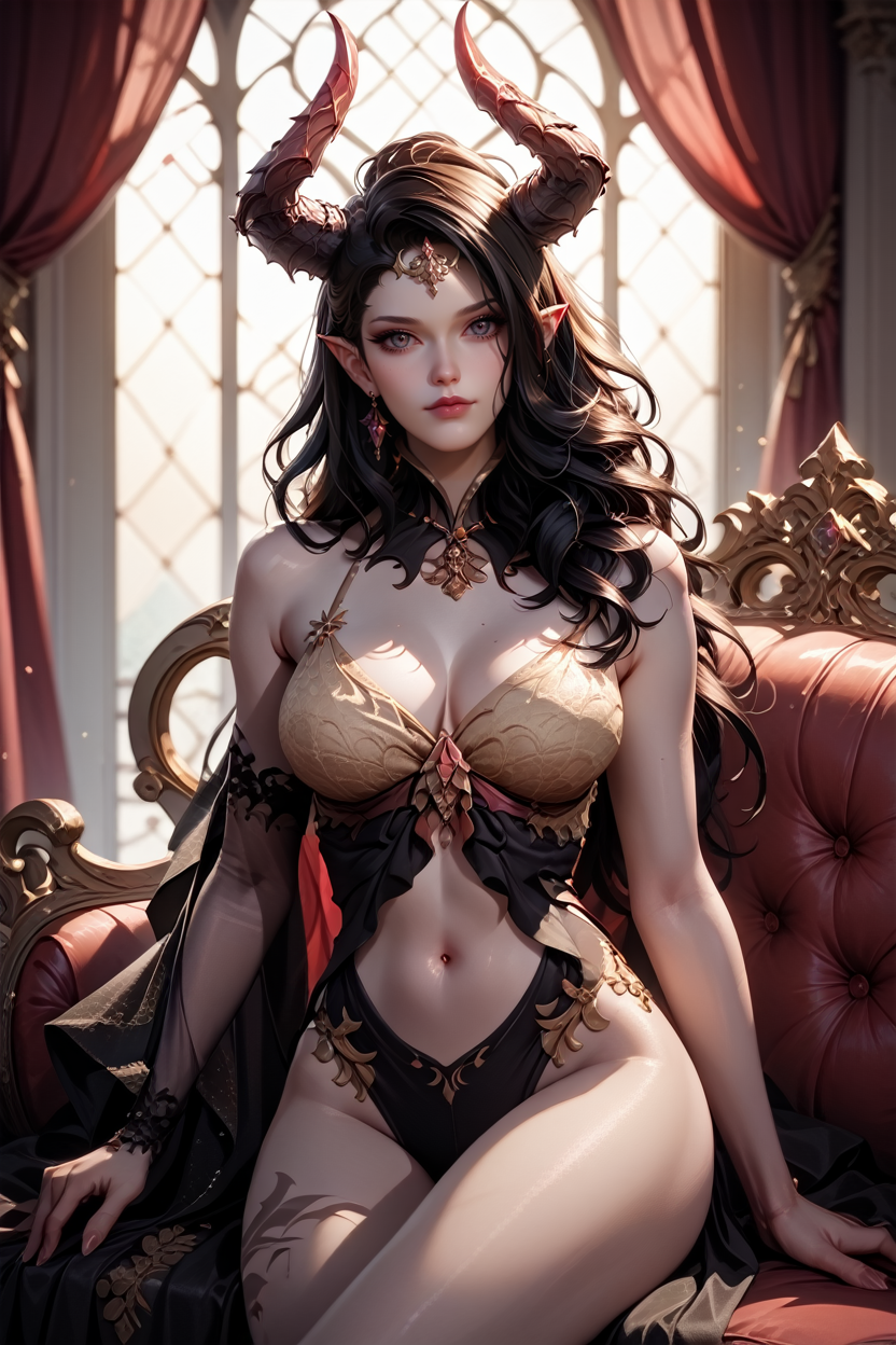 LAVykas, 1girl, black hair, long hair, pointy ears, demon horns