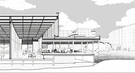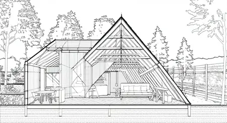 architecture, a section perspective drawing of a house with a roof and a porch area with a table and chairs and a bench, David Chipperfield, archdaily, modernism