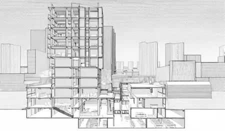 architecture, a section perspective drawing of a building with a lot of windows and a lot of people walking around it and a lot of windows, David Chipperfield, isometric view, modular constructivism