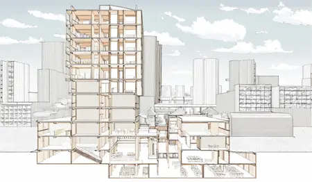 architecture, a section perspective drawing of a building with a lot of windows and a lot of people walking around it and a lot of windows, David Chipperfield, isometric view, modular constructivism