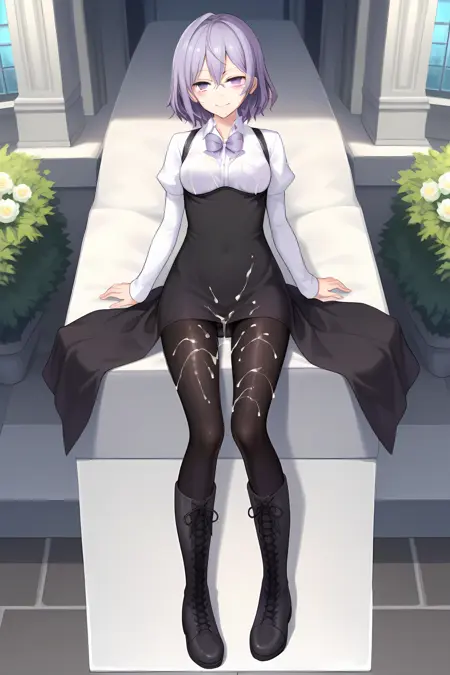 검은 드레스, 짧은 드레스, 흰 셔츠, 긴 소매, 검은 팬티스타킹, 흰 무릎 부츠, 활매듭