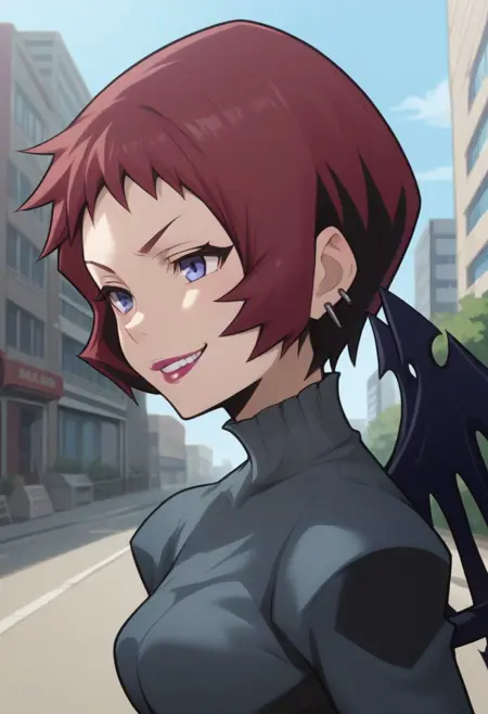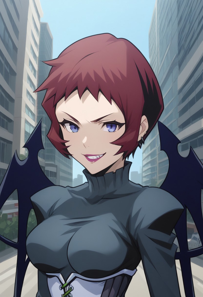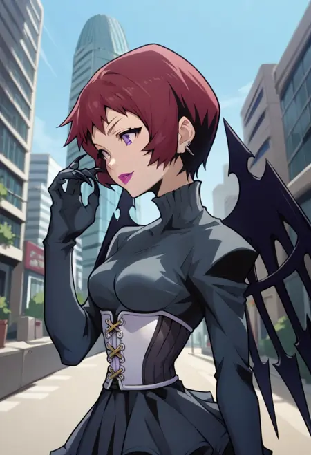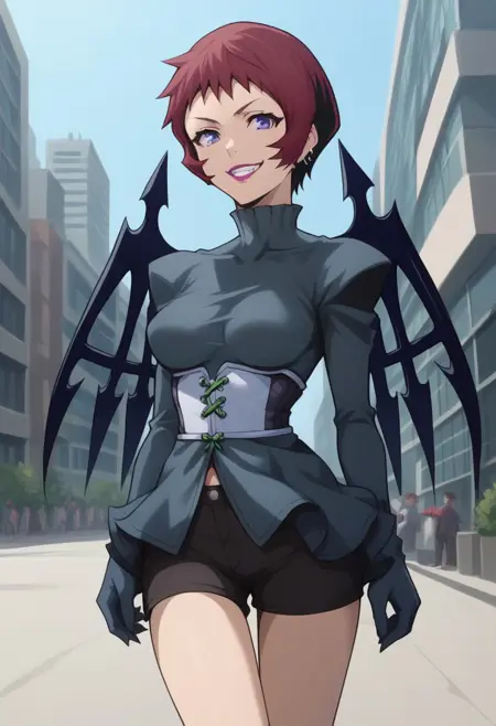 uzuki, 1girl, solo, 短い髪, 赤髪, 紫髪, 耳輪, リップスティック, メイク, グレーのシャツ, コルセット, 胸, へそ, 翼, 黒い翼, 手袋, 黒いショートパンツ, 短いショートパンツ, ヒザブーツ, 高いヒール