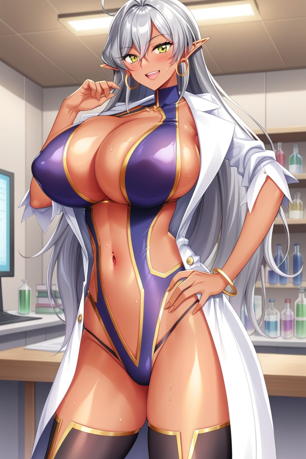 黄色い目、灰色の髪、尖った耳、長い髪、リング型の耳飾り、ダークエルフ、巨乳
