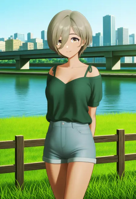 short sleeves,denim shorts,green straps,green sweater,off-the-shoulder sweater,