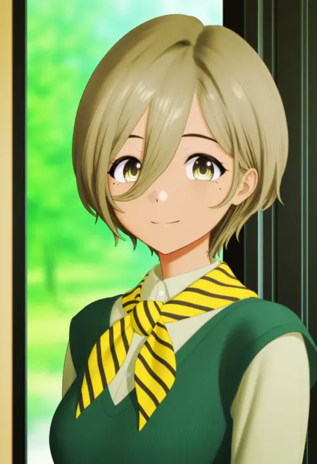 - yellow eyes,short hair,hair between eyes,mole under eye,gray green hair,