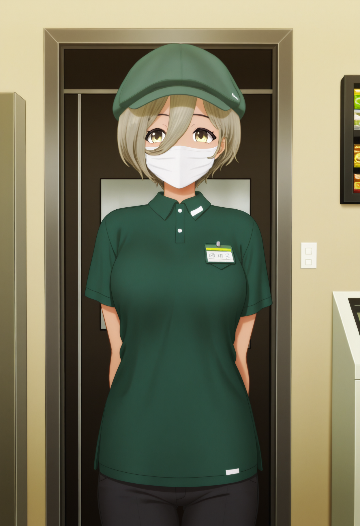 흰 마스크, 얼굴 가리개, 직원 복장, 녹색 셔츠, 짧은 소매, 검은 바지, 녹색 비니,