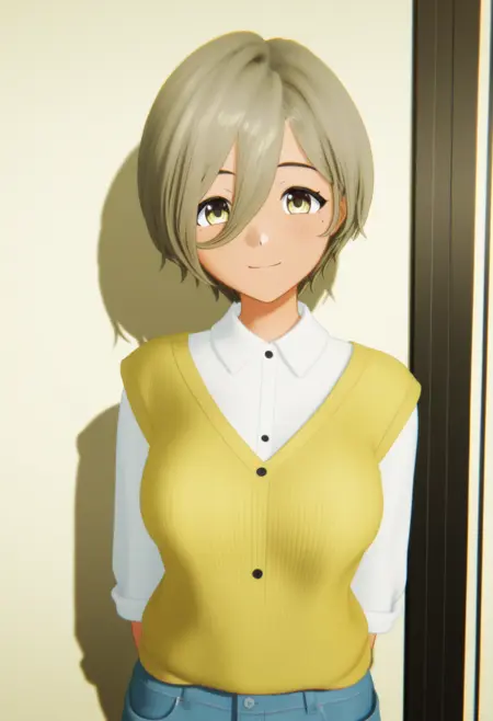 sweater vest,white shirt,cardigan,collared shirt,denim_shorts,yellow sweater,