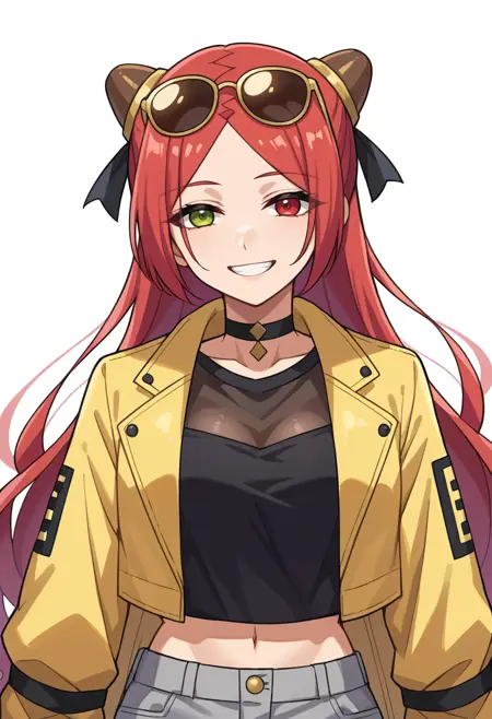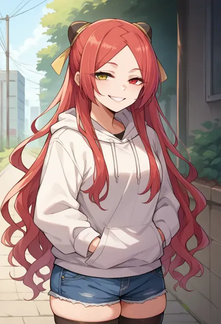 TomoshibiDefault, heterochromia, red hair, long hair, parted bangs, hairpods, hair ribbon, white ribbon, black choker, blue sailor collar, purple neckerchief, sleeveless shirt, white shirt, detached sleeves, fingerless gloves, arm belt, black corset, navel, black belt, blue skirt, black pantyhose, white thigh strap, white knee boots