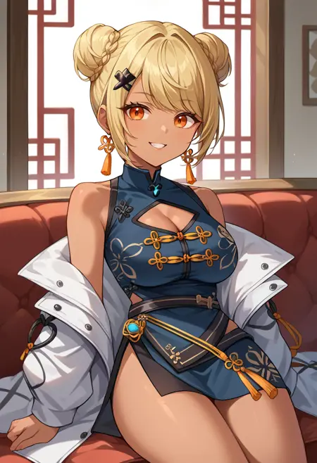 QpiChn, 주황색 눈, 검은 피부, 금발, 흐트러진 앞머리, 더블 둥, 머리 장신구, 털 달린 귀걸이, 파란색 드레스, 중국 드레스, 힙 벤트, 높은 칼라, 가슴 절개, 어깨 절개, 검은 벨트, 흰색 재킷, 어깨 드롭 재킷