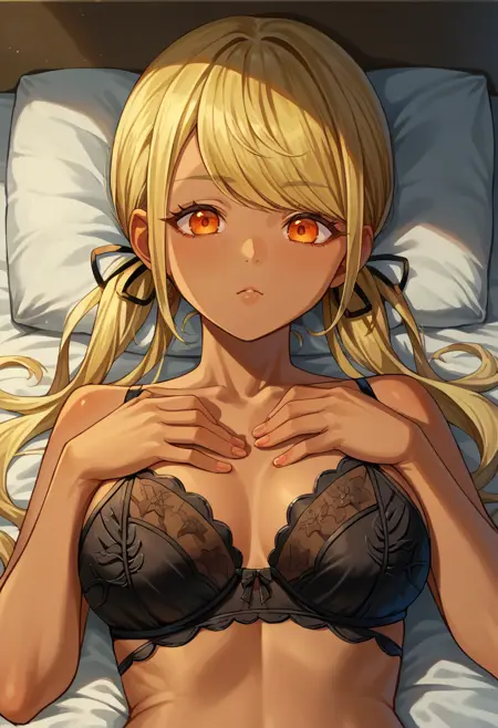 KaminariQpi, 주황색 눈, 검은 피부, 금발, 긴 머리, 흐트러진 앞머리, 낮은 쌍꼬리