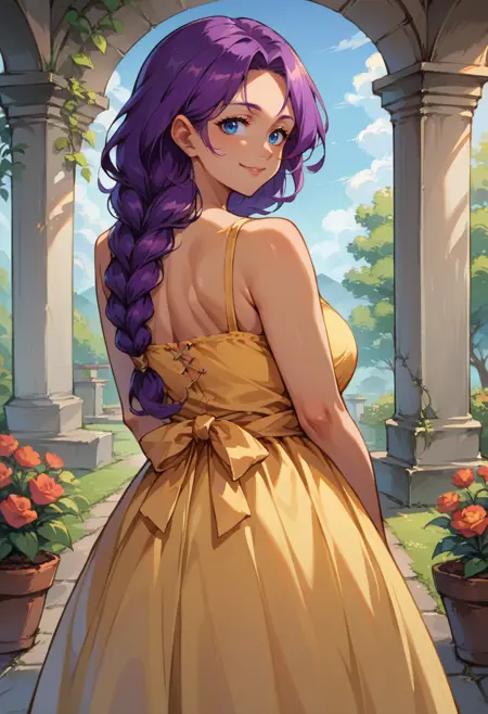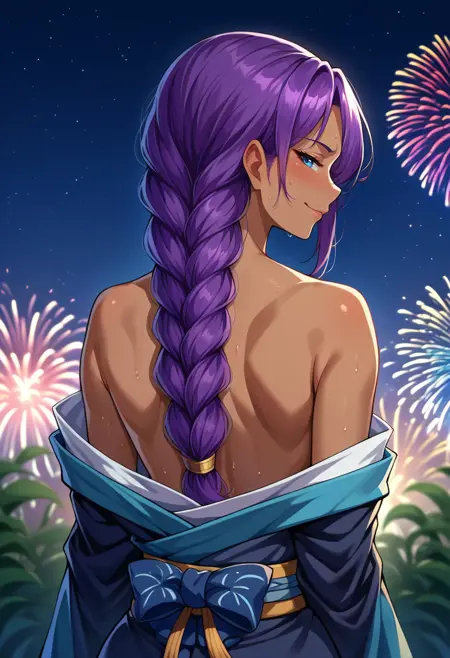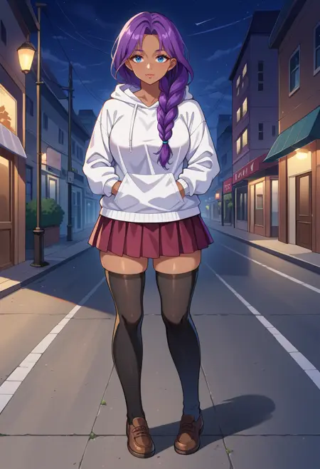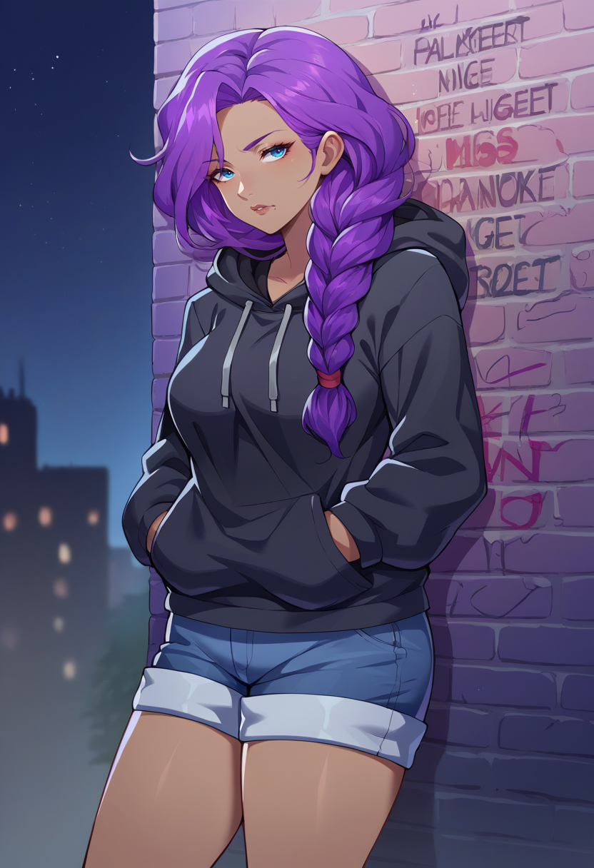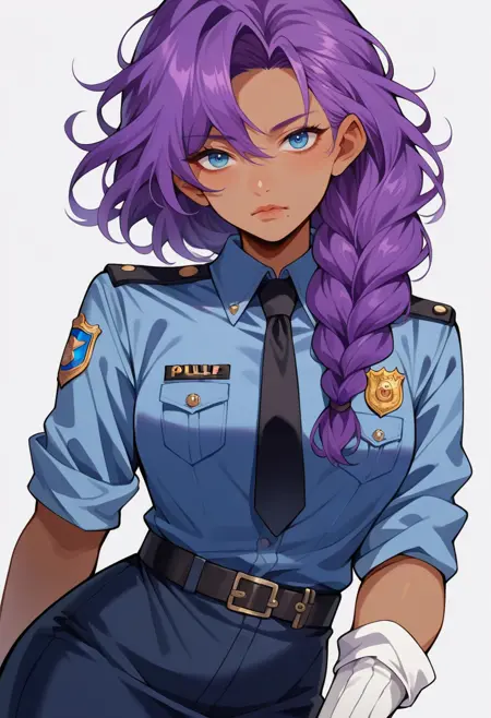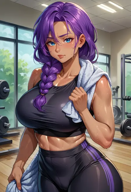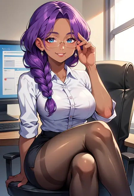 ChaMmVT, mature female, blue eyes, mole under mouth, purple hair, long hair, braided ponytail, hair over shoulder, dark skin