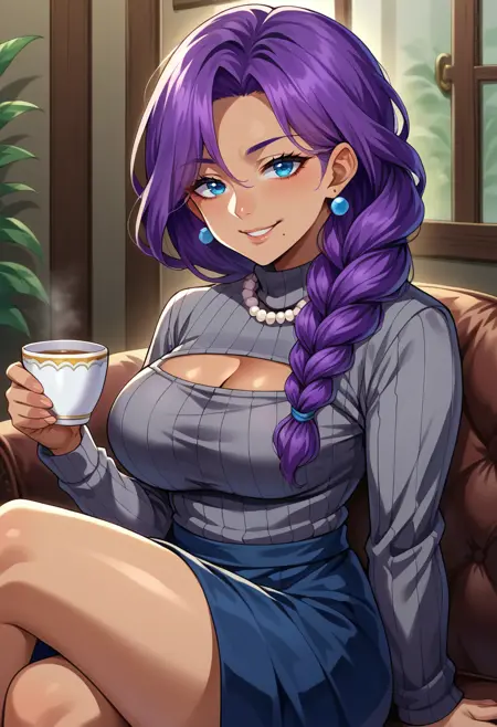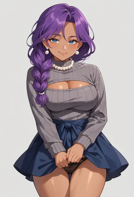 ChaMmVT, mature female, blue eyes, mole under mouth, purple hair, long hair, braided ponytail, hair over shoulder, dark skin, earrings, pearl necklace, grey sweater, open-chest sweater, cleavage cutout, blue skirt, bare legs