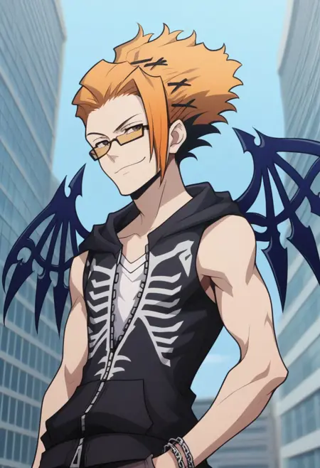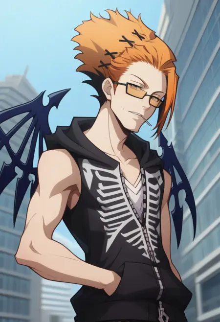 kariya, 1boy, male focus, solo, オレンジ色の髪, ヘアクリップ, 立ち上がった髪, オレンジ色の目, めがね, フーディー, 袖なしフーディー, フード, フードを下ろした, フードを下ろした, 翼, パンツ, 財布のチェーン, 靴, グレーの靴