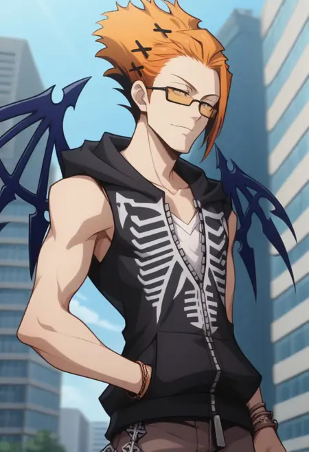 kariya, 1boy, male focus, solo, orange hair, hairclip, spiked hair, orange eyes, glasses, hoodie, sleeveless hoodie, hood, hood down, hood down, wings, pants, wallet chain, shoes, grey footwear