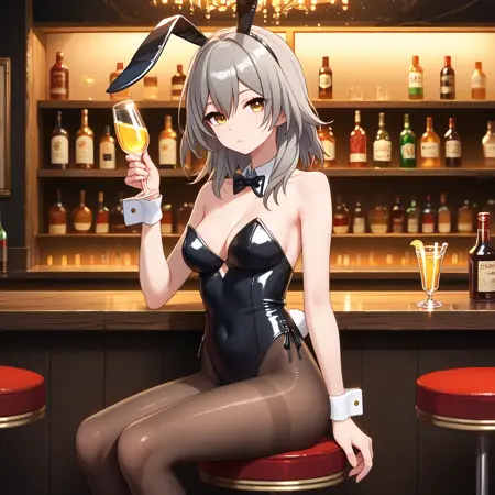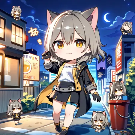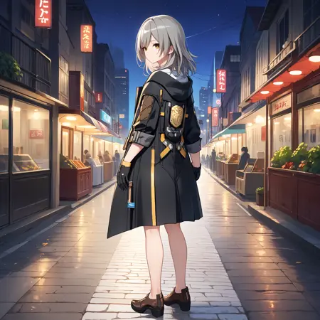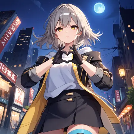 Default : stelle \(honkai: star rail\), medium hair, grey hair, yellow eyes, stelle def, black jacket, open jacket, jacket, coat, white shirt, black gloves, miniskirt, black skirt, thigh strap,