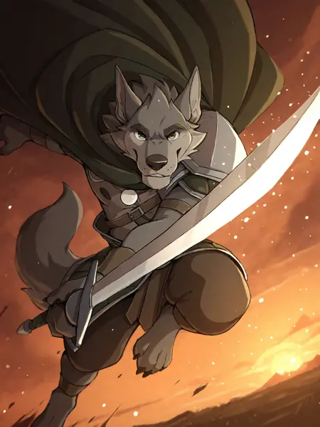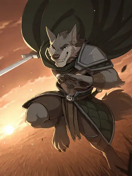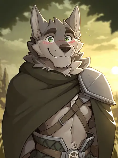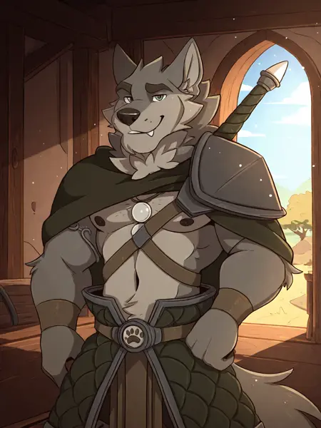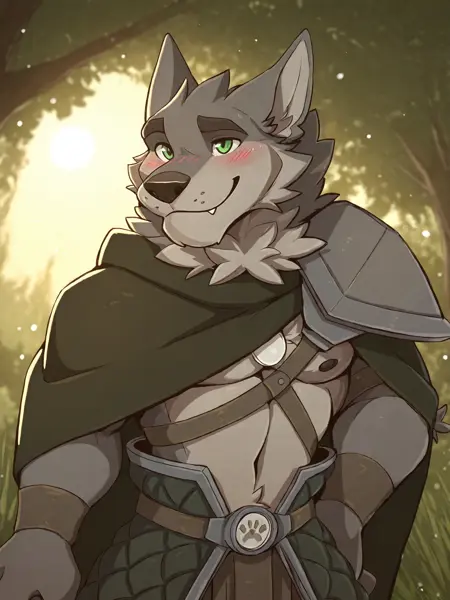 강화 프롬프트: "애너드로, 남성, 녹색 눈, 근육질, 늑대 꼬리,"