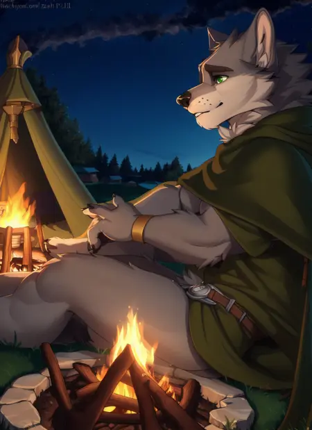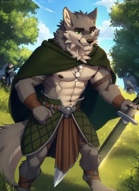 강화 프롬프트: "애너드로, 남성, 녹색 눈, 근육질, 늑대 꼬리,"