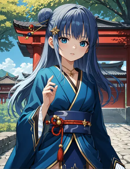 의식복: mgrcyachioutfits, nmocmn, 긴 머리, 옆머리 땋기, 금색 머리바늘, 금색 머리핀, 금색 목걸이, 파란 유카타, 파란 오비, 빨간 오비지메, 흰 프릴, 파란 허리띠, 파란 허벅지 양말