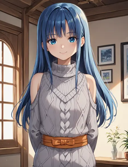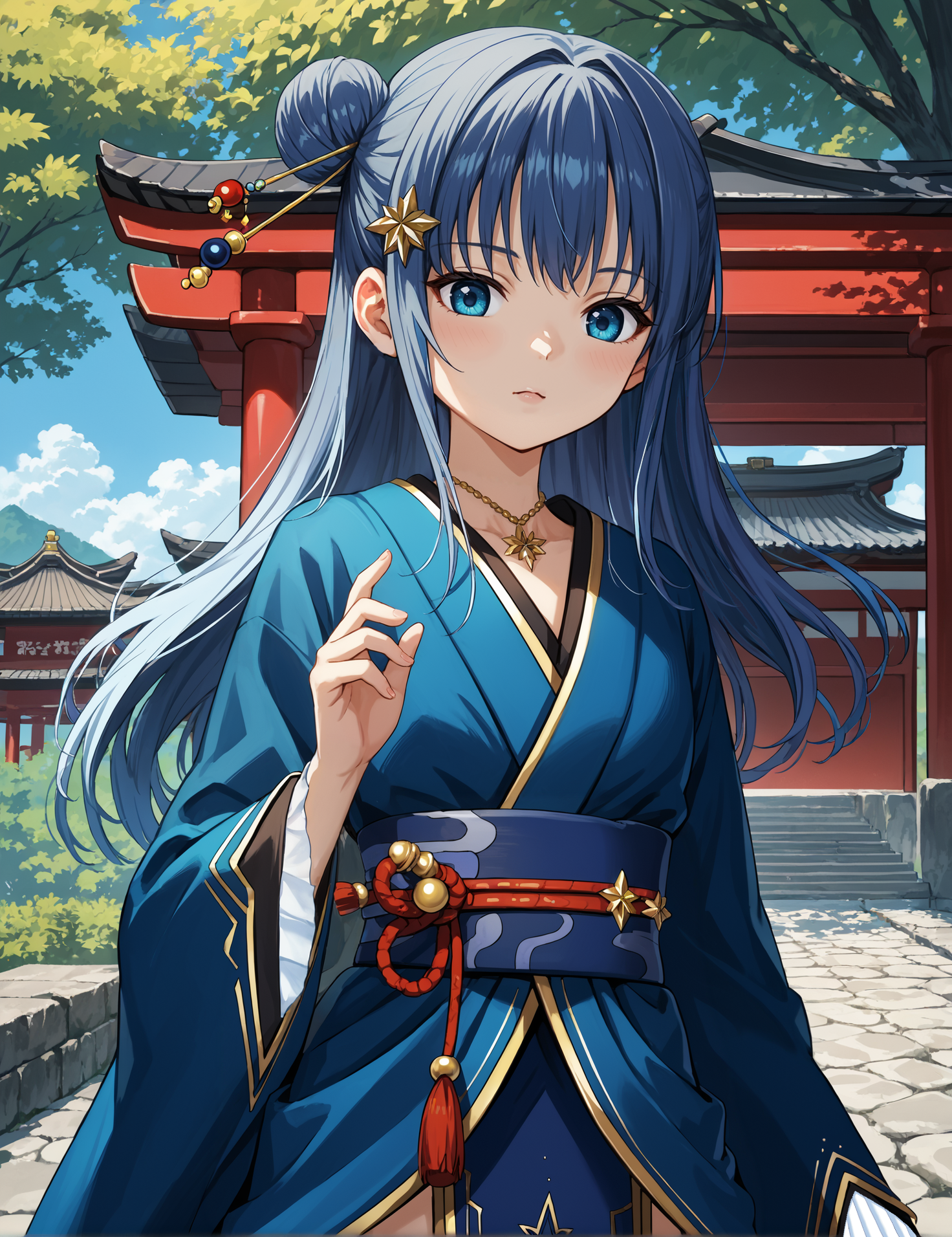 礼服: mgrcyachioutfits, nmocmn, 长发, 侧边发髻, 金色发簪, 金色发夹, 金色项链, 蓝色浴衣, 蓝色腰带, 红色腰带结, 白色花边, 蓝色兜裆布, 蓝色过膝袜