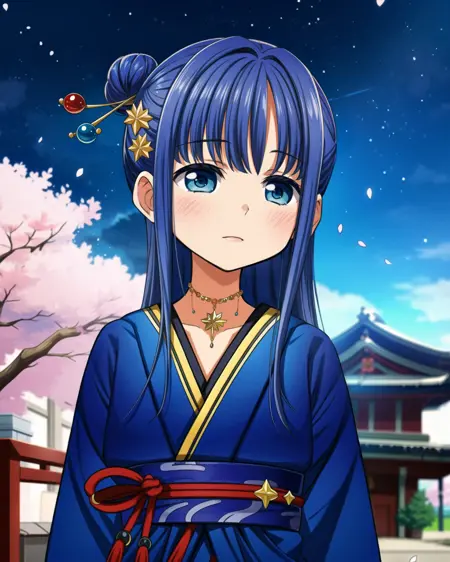 儀礼衣装: mgrcyachioutfits, nmocmn, 長い髪, 片側の結び目, ゴールドの髮簪, ゴールドの髪留め, ゴールドのネックレス, 青い浴衣, 青い帯, 赤い帯締め, 白いフリル, 青い褌, 青いシンソックス
