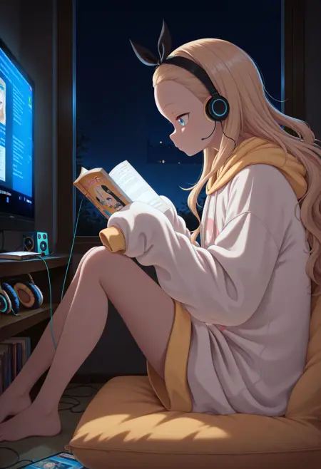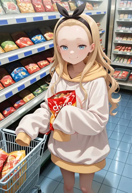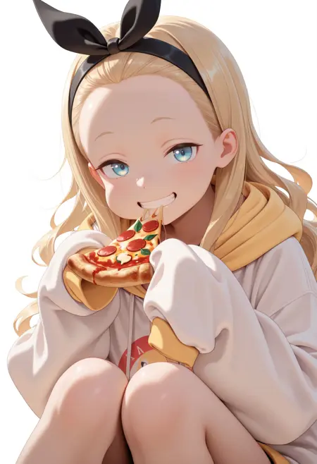 アウティット1:1人女の子、金髪、髪リボン、長い髪、黒いリボン、黒い髪バンド、額、青い目、フード付き、白いフード付き、ドローストリング、長袖、指より長い袖、素足、