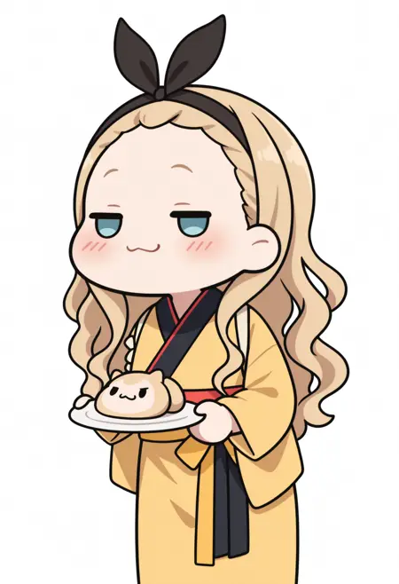 アウティット2:1人女の子、単体、長い髪、波状の髪、金髪、髪リボン、長い髪、黒いリボン、黒い髪バンド、額、青い目、額、黄色い着物、帯、帯、白いタスキ、白い腰エプロン、長いエプロン