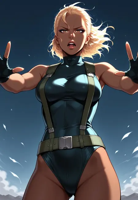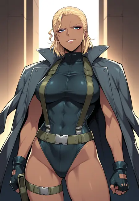 Outfit - leotard, suspenders, belt, fingerless gloves, Coat on shoulders, thigh holster, boots,