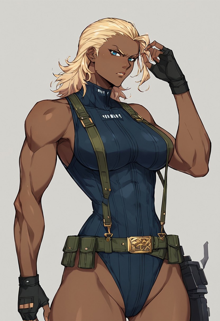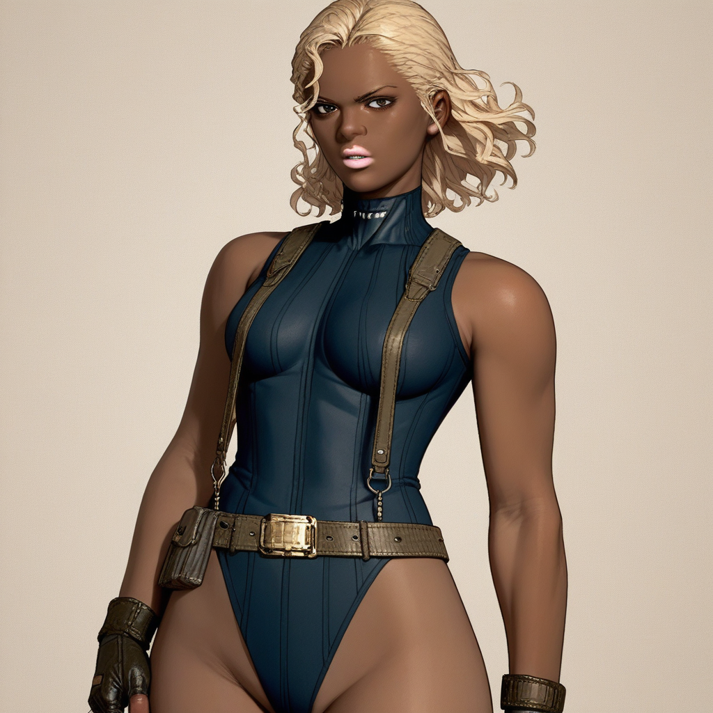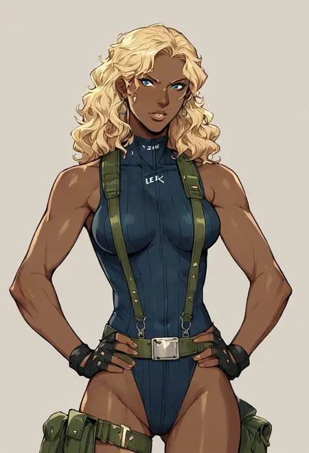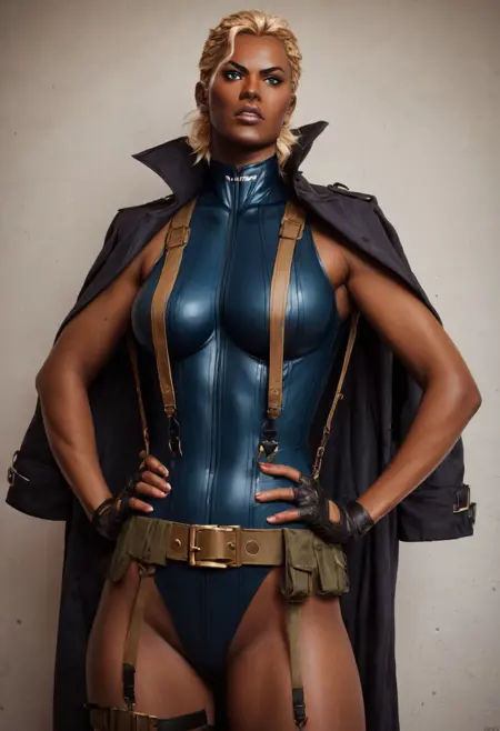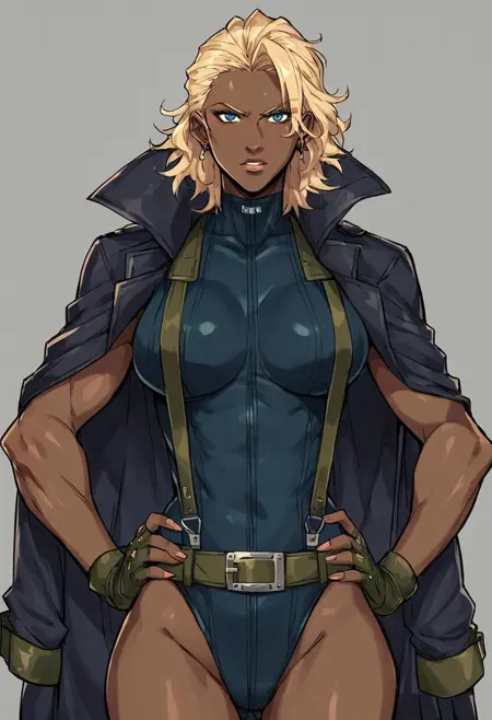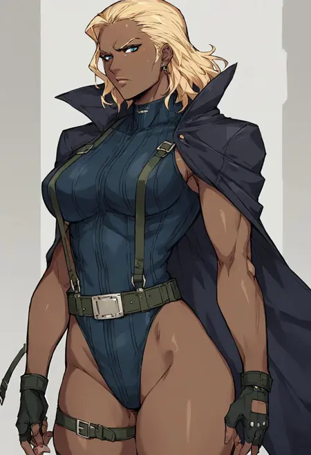 옷 - 레오타드, 서스펜더, 벨트, 손가락 없음 장갑, 어깨에 두른 코트, 허벅지 홀스터, 부츠,