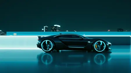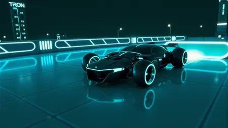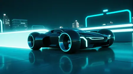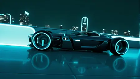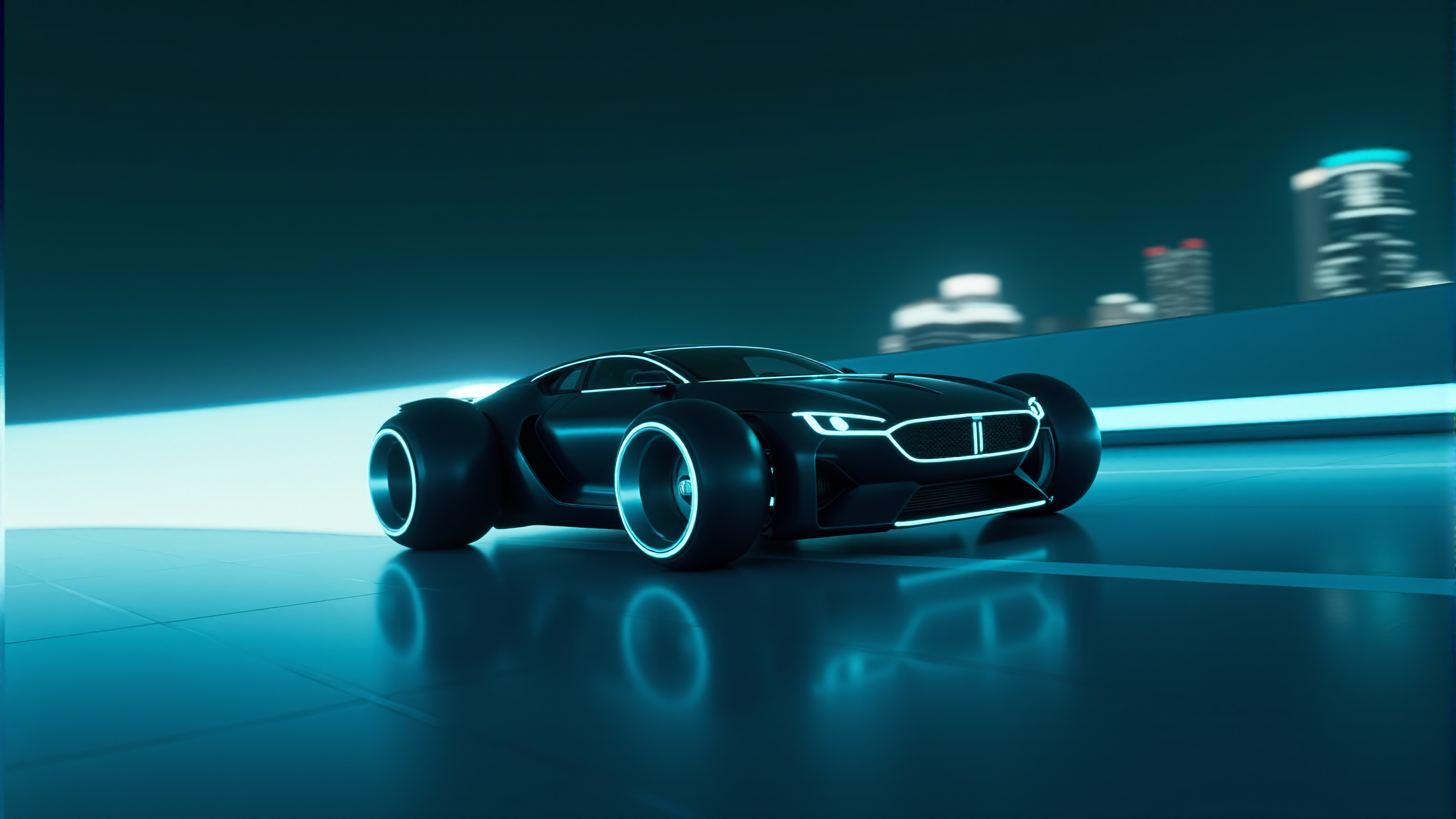 (高速で動くコンセプトカーがmotion blurの光の軌跡を残すアクションショット:1.4)、(上からのショット、((上から))のカメラアングル、トップビューカメラ:1.5)、コンセプトカー、Tronスタイル、ダイナミックなアングル、(クローズアップ:1.1)、モーションブラーレ、暗いウィンドウ、スピードライン、繊細な青いライン、暗い背景にTroncity、(傾いたカメラ、バンクターン:1.4) (繊細な青いラインのグリッド床:1.2) (車の側面に「TRON」というテキスト:1)