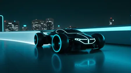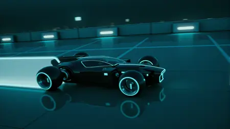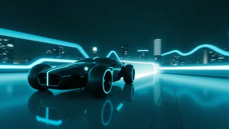long exposure photo of (action shot of a fast-moving concept car leaving behind a trail of motion blurred light:1.4), (close-up shot, ((from above)) camera angle, top view:1.5), concept car, Tron style, dynamic angle, (close-up:1.1), motion blur, dark windscreen, speed lines, intricate blue lines, Troncity in dark background, (tilted camera, banked turn:1.4) (grid floor with intricate blue lines:1.2) (text "TRON" on side of the car:1)