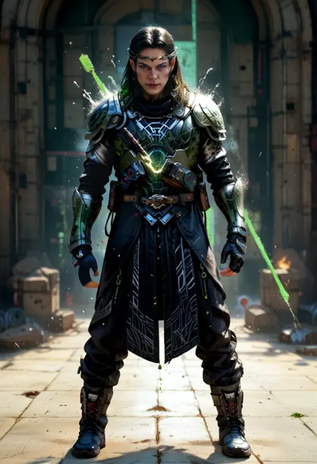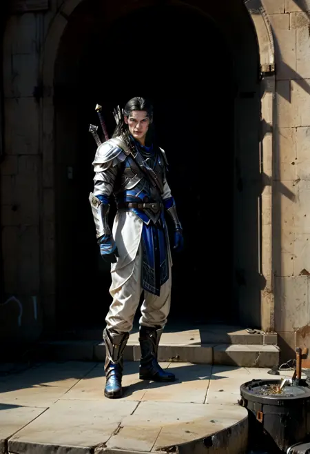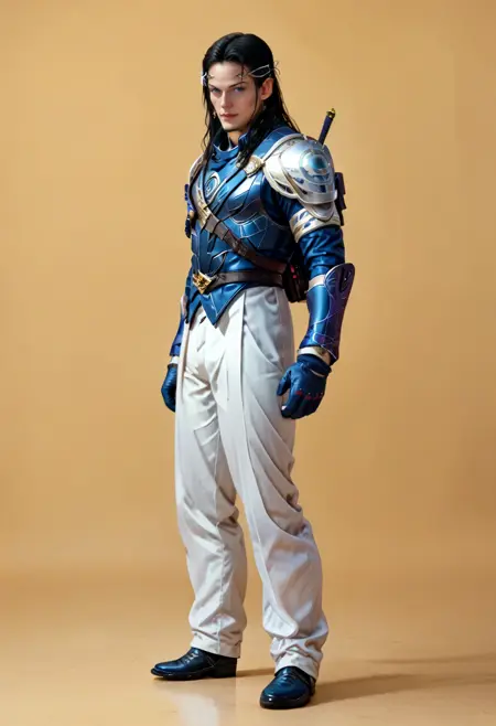 建议将 LoRA 的强度降低至 0.75,或 在负面提示中添加 "armor",或两者同时使用,以便按你的喜好调整他的服装风格;否则服装会过于厚重盔甲化。
