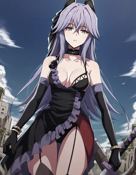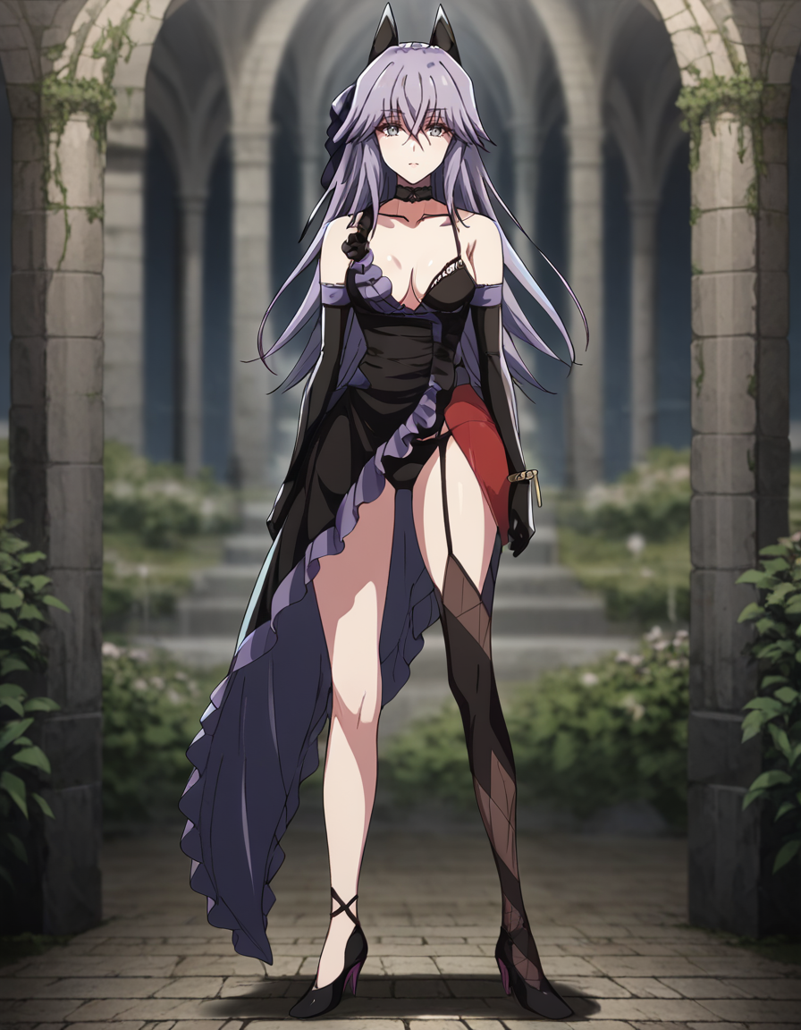 견갑골, 가슴 사이, 검은 목걸이, 검은 브라, 검은 꽃, 검은 드레스, 빨간 드레스, 프릴, 꽃, 비대칭 옷, 팔꿈치 장갑, 팔찌, 검은 속옷, 비대칭 하의, 허벅지 끈, 한쪽 허벅지 스타킹, 하이힐