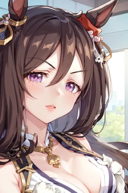 • 1girl,动物耳朵,单人,紫色眼睛,马耳朵,灰色眼睛,眼下方痣,黑发,马尾,超长发,绿色眼睛,双色发,嘴唇,眼间头发,蓝色眼睛,棕发,官方替代服装,刘海,马娘,张开的嘴唇,长发,红唇,多彩发,简单背景