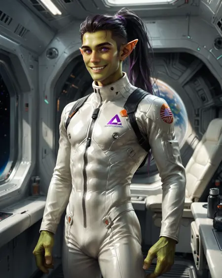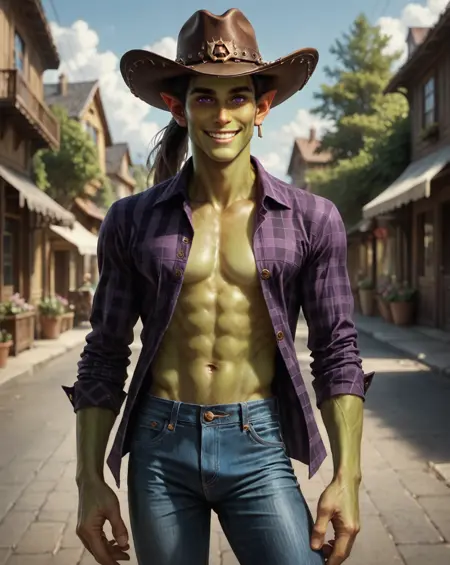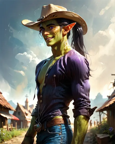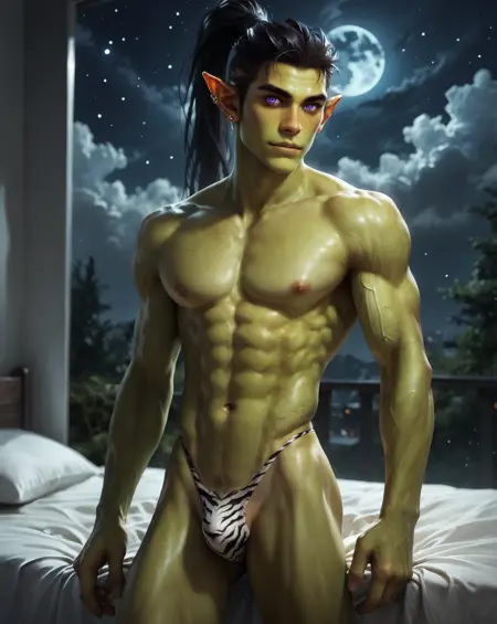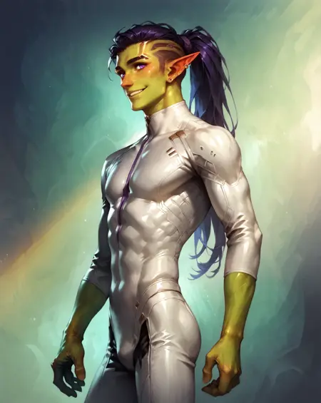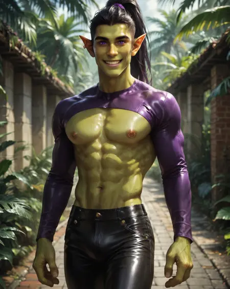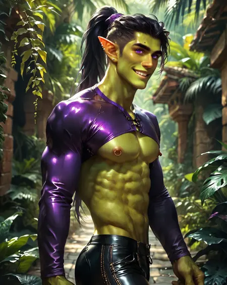 彼の色を強調するための追加トリガー:緑色の肌、黒い目、紫の紐で結んだポニーテール