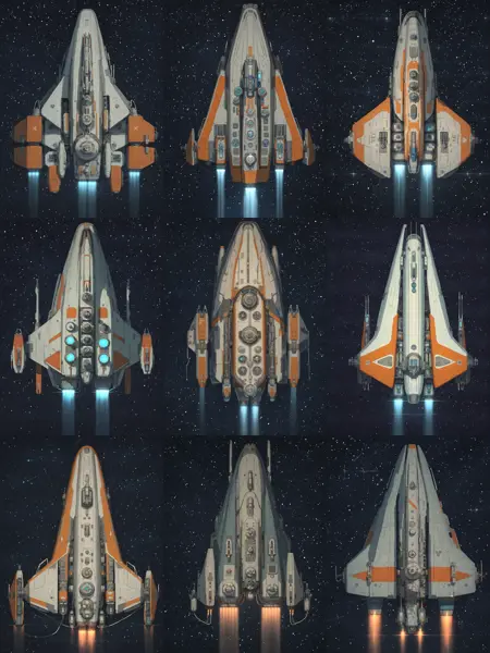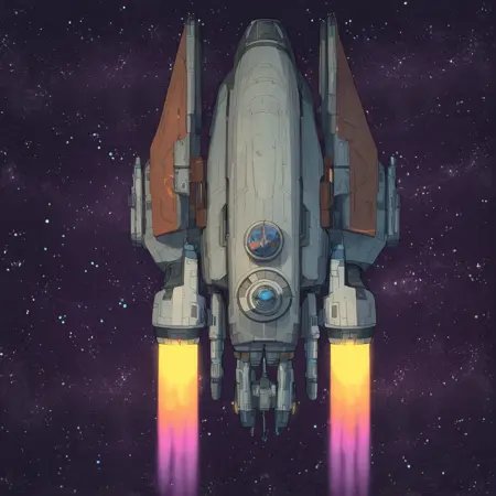 プロンプト: score_9, score_8, score_7, score_6, lora:Starship_Hulls_-_Pony_r1:1 st4rhu11s, 星空の背景, 星船, 宇宙船, スラスター
