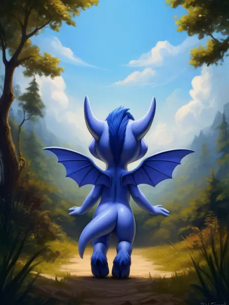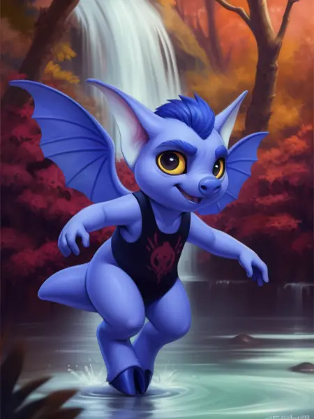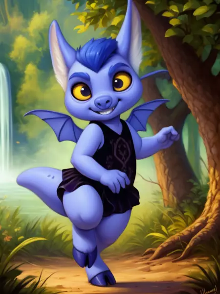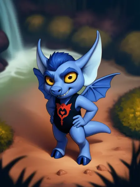 ImpShRaCartoonII, imp, (chibi, small body,) black T-shirt,, Mohawk, Fangs, blue skin, Small wings, Small Tail, Yellow sclera, black eyes, hooves,