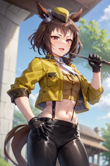 - 귀 장식, 기동부대 모자, 검은 장갑, 흰목도리, 크롭톱, 반어밴드, 긴소매, 노란 자켓, 크롭 자켓, 오픈 자켓, 오픈 코스튬, 벨트, 검은 바지, 검은 신발, 하이힐 부츠
