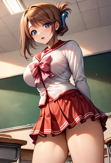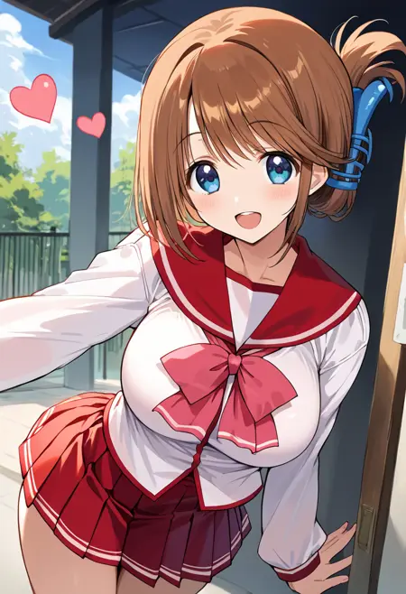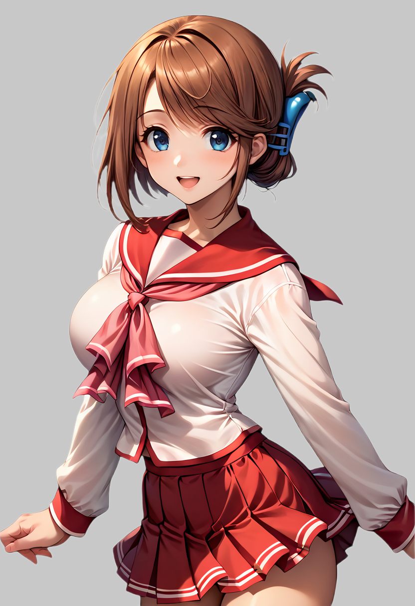 school uniform, serafuku, red sailor collar, pink bowtie, long sleeves, red skirt, mini skirt, large breasts, brown hair, bangs, folded ponytail, hair ornament, short hair, swept bangs, blue eyes