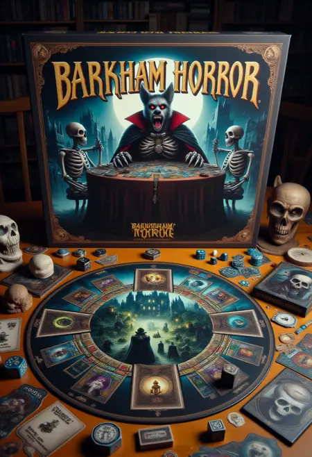 The background depicts a lively, cartoonish setting with a spooky, (THING)-themed (PLACE) at night, with a spooky (THING) in the background, illuminated by a full moon.
