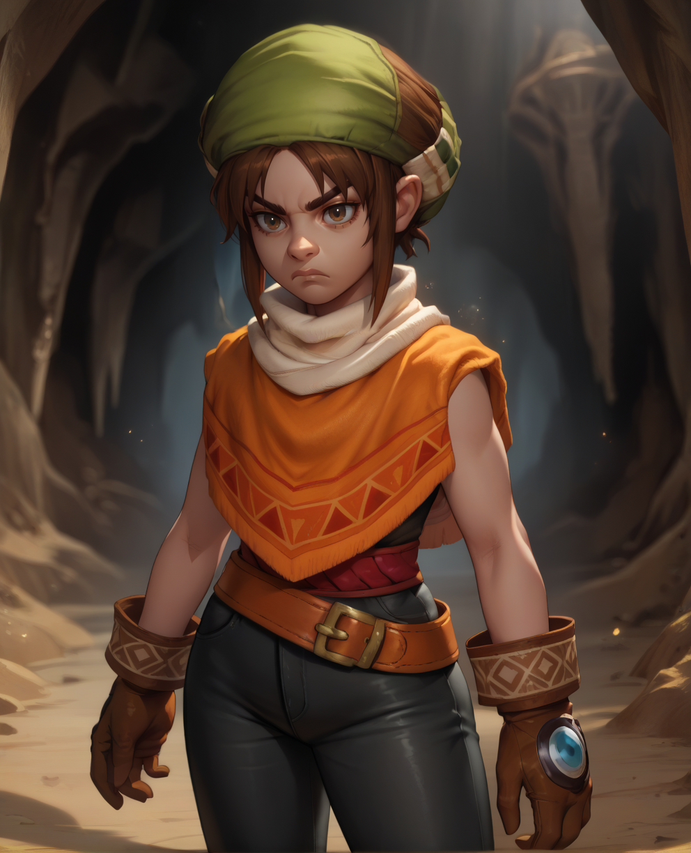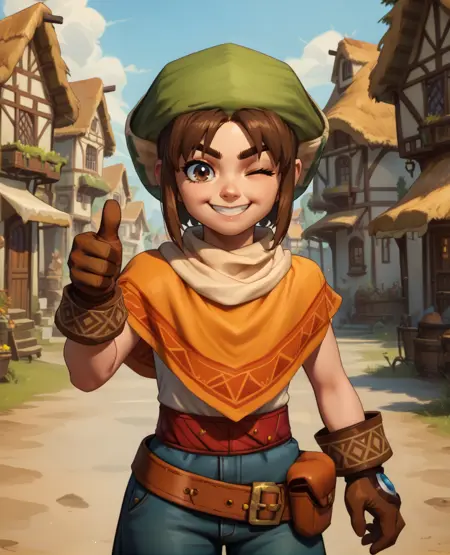 橙色斗篷,绿色帽子,腰带,棕色手套,黑色裤子,白色颈饰,红色腰带,棕色靴子,