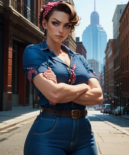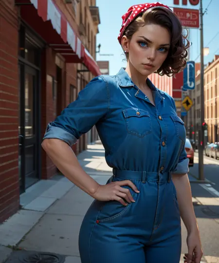 이것은 전쟁 중 여성 공장 노동자들의 상징적 마스코트인 로지 더 라이버터의 전형적인 외모를 재현하기 위한 것이다.