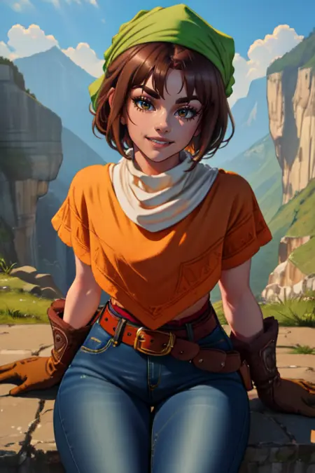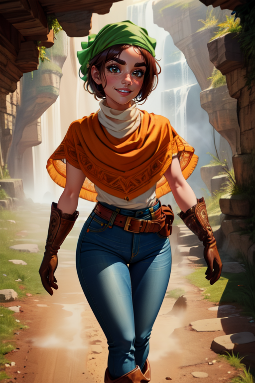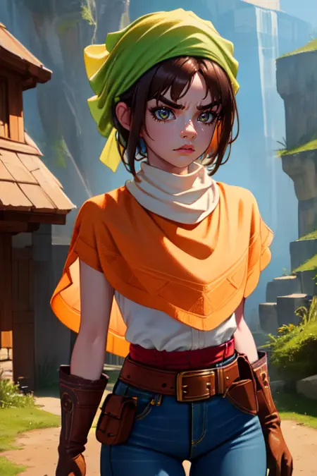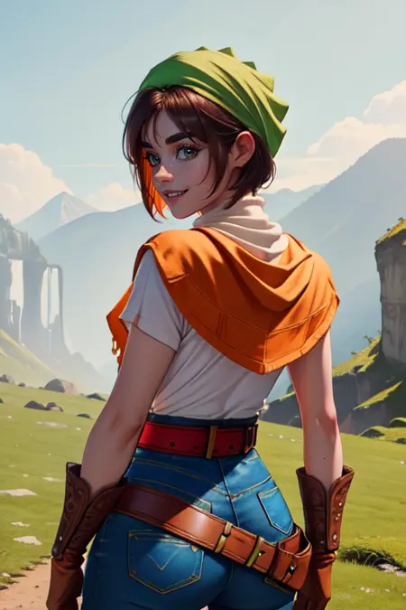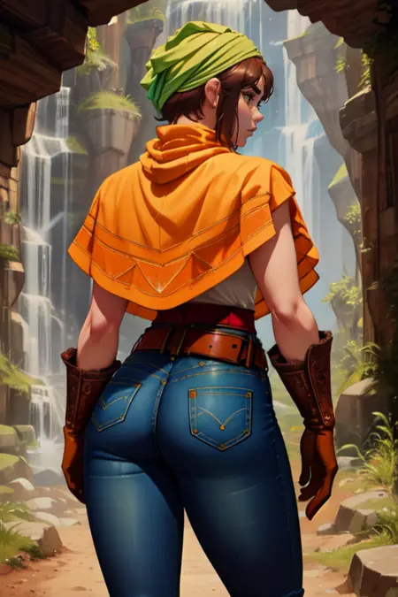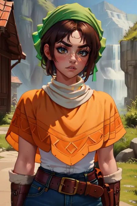 주황색 파코, 초록색 모자, 벨트, 갈색 장갑, 검은 바지, 하얀 목줄, 빨간 허리밴드, 갈색 부츠
