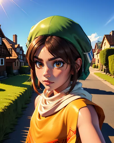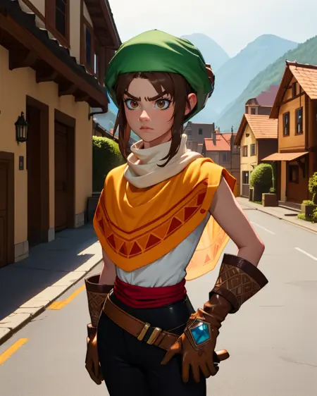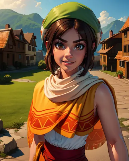 orange poncho,green hat,belt,brown gloves,black pants,white neck wrap,red waistband, brown boots,