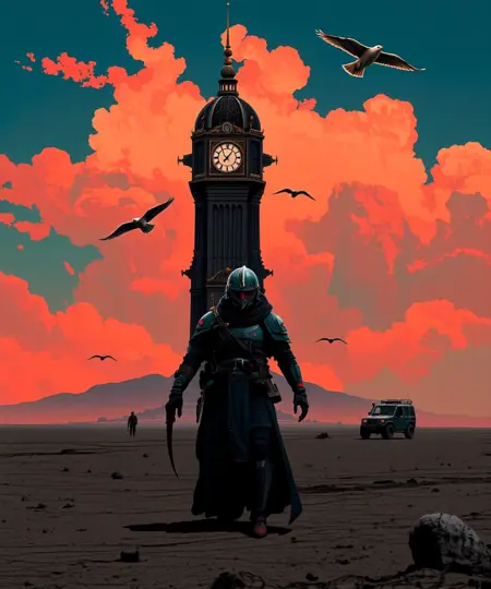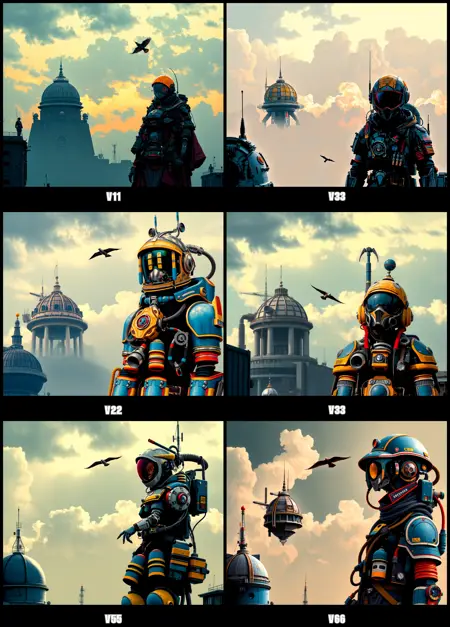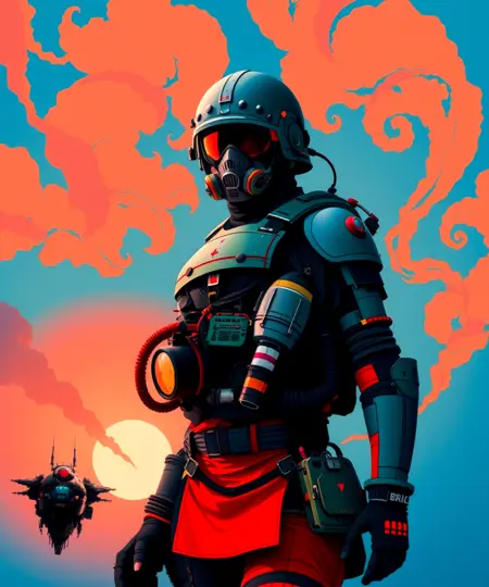 该模型在描绘佩戴头盔、身着精密科技装备的角色,置身于戏剧性天幕之下的场景中表现尤为突出,其一贯风格融合了科幻、蒸汽朋克与后末日美学,形成统一的视觉语言。